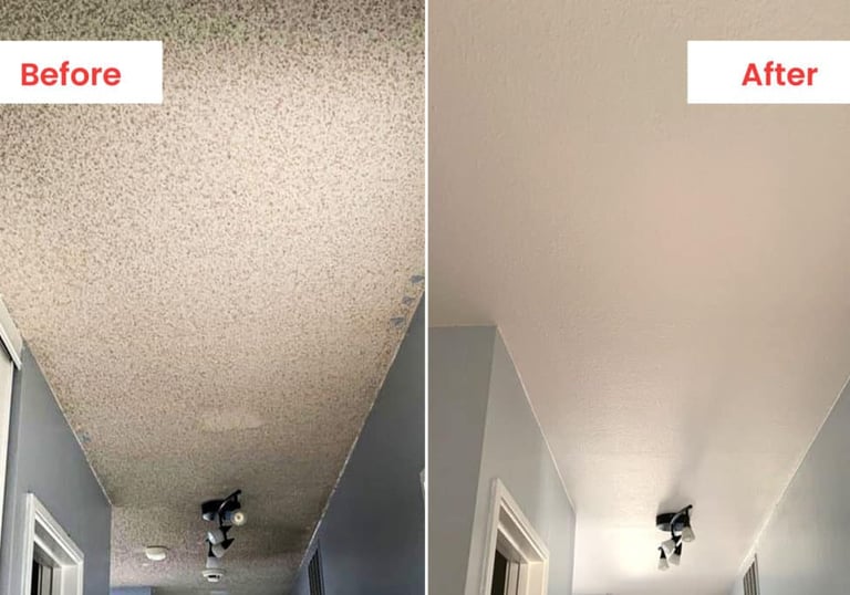 MrWalls Drywall & Painting has removed hundreds of popcorn ceilings, giving the home bright, modern, smooth ceilings. The process will vary depending on whether the texture has been painted. If it was never painted, spraying water on the texture will reactivate the water-based glue, allowing the texture to be easily scraped off onto plastic drop tarps. Repairs to the drywall surface paper are then made, fixing any cracks and gouges that the texture had been hiding. Finally, the ceiling is sanded and primed with a special sealing primer, such as oil-based Kilz or Kilz Clear Latex Sealer. This primer is essential to seal the powdery surface when scraping popcorn ceilings, preventing the ceiling paint from peeling down the road.